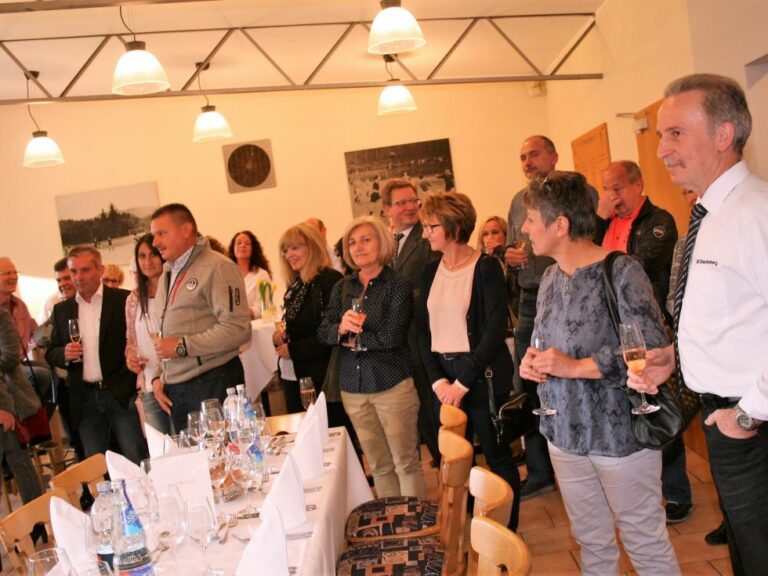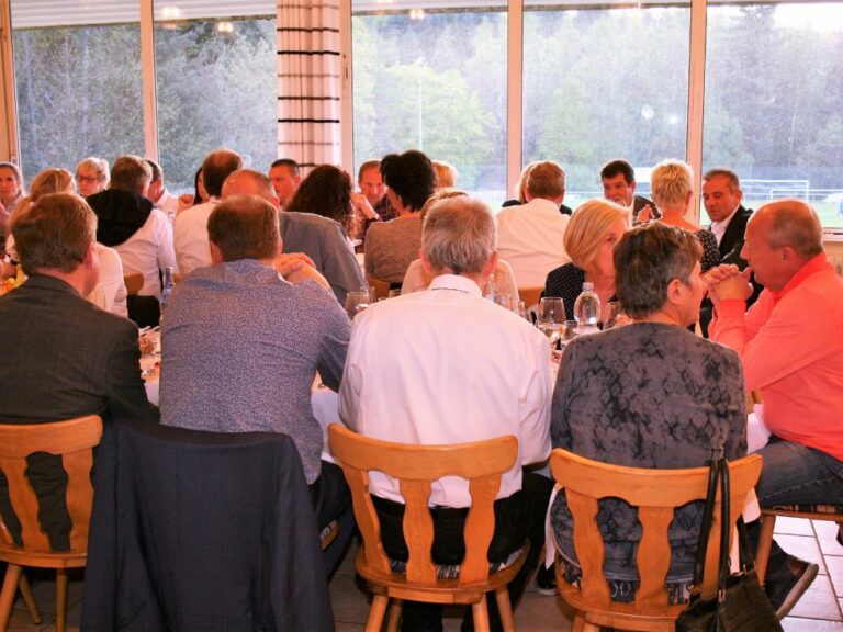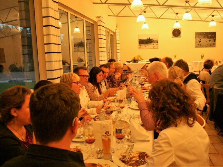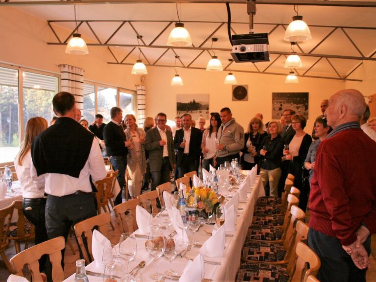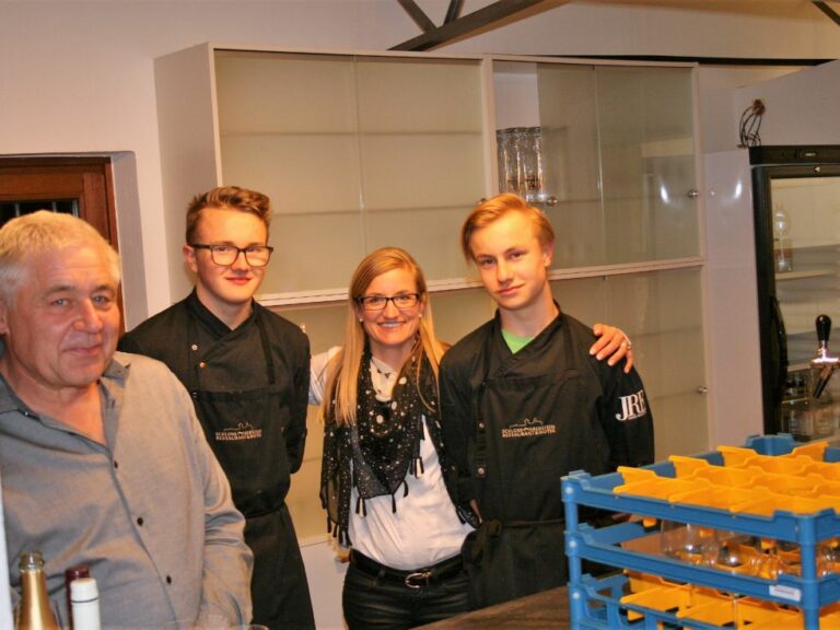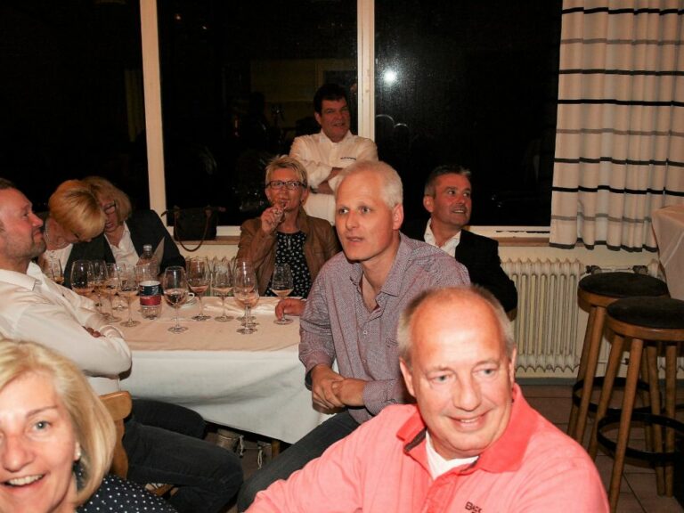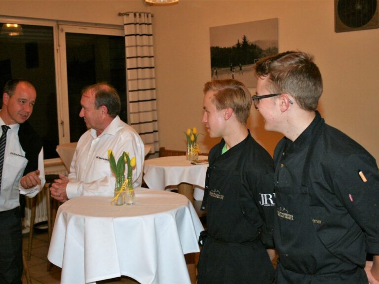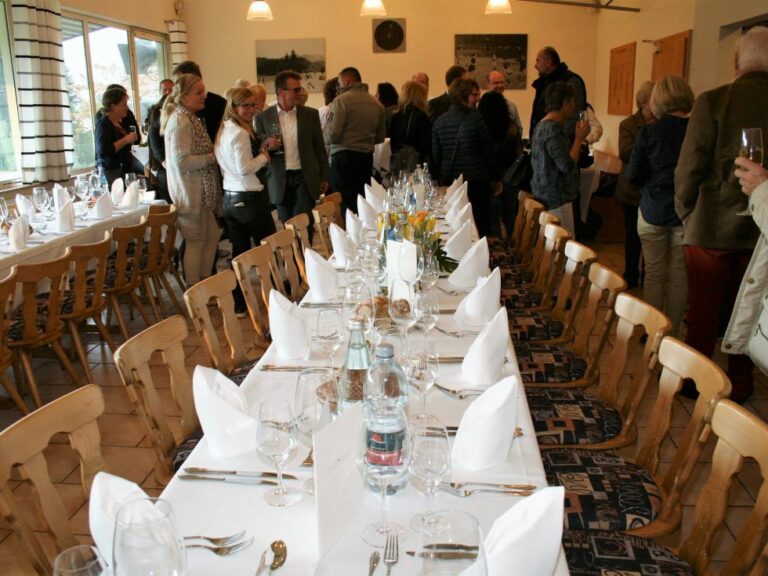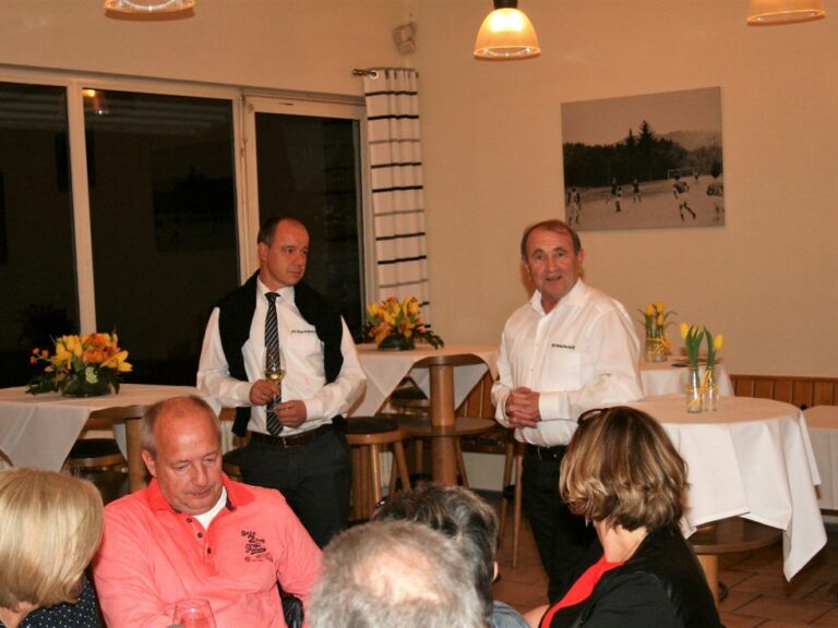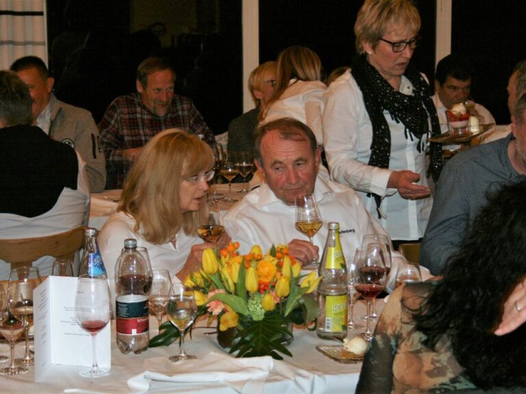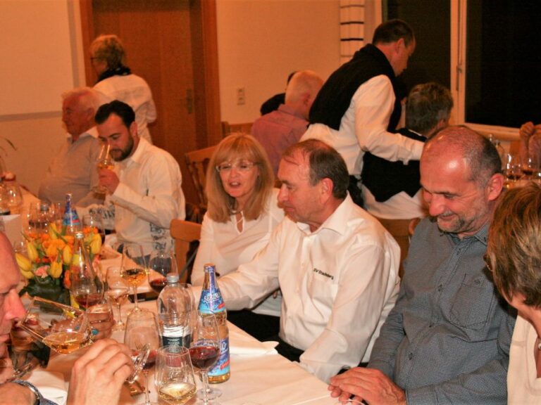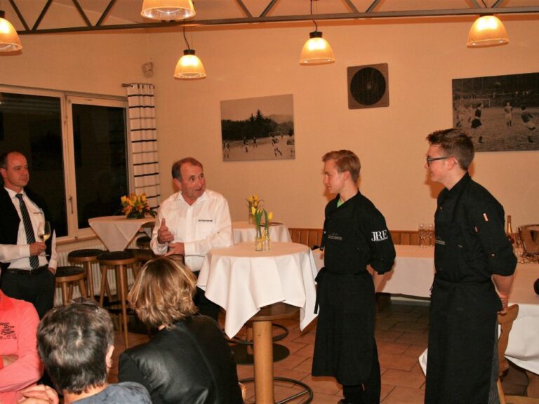 Nach dem Sektempfang und der Begrüßung durch Fördervereins-Chef Martin Dernbach im vollbesetzten Clubhaus gab es die Weinprobe vom Schloss Eberstein. Neben dem Rose-Sekt kamen Weißwein, Rotwein und Dessertwein zur Verkostung. Das Wildschwein wurde zubereitet durch Gourmet-Koch Bernd Werner vom Schloß Eberstein, der unterstützt wurde von den Nachwuchs-Gourmets-Köchen Nico Werner und Phillip Dernbach, die jeweils die Vor-Haupt-und Nachspeisen profihaft vorstellten.